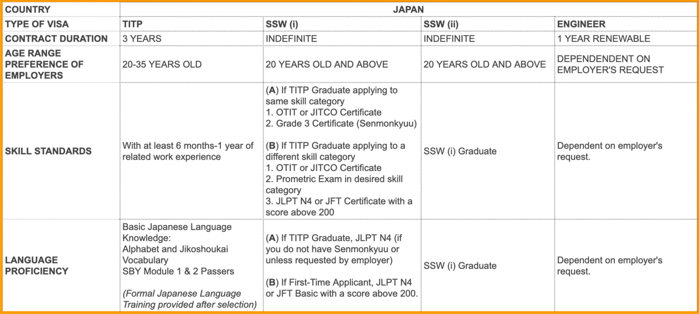 The qualifications for Japan depend on the type of visa in the job order. Please note that if you did not finish your three-year TITP contract, you can only apply for TITP positions.